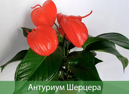 В сравнении с другими сортами – неприхотливое растение. Его особенность в более округлой форме покрывала и необычной расцветке: красного, оранжевого или белого цвета с обильным вкраплением. В ходе цветения покрывало вырастает до 15 см в длину. Початок выглядит необычно: вытянутый до 10 см в длину, закручивается по спирали, может быть желтого или красноватого оттенка. Отличительной чертой Шерцера является короткий стебель и цветоносы, вдвое превышающие длину черешков.
