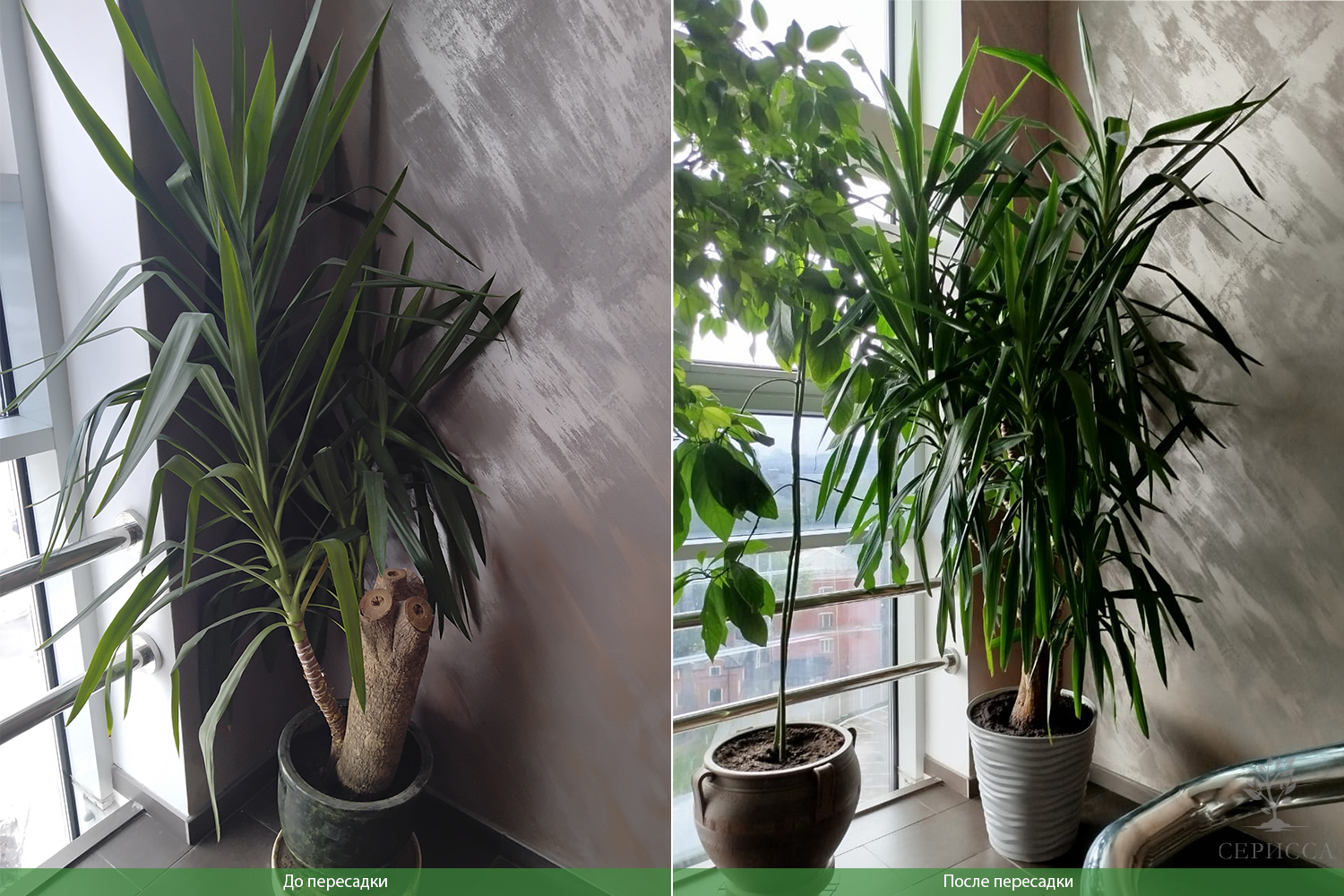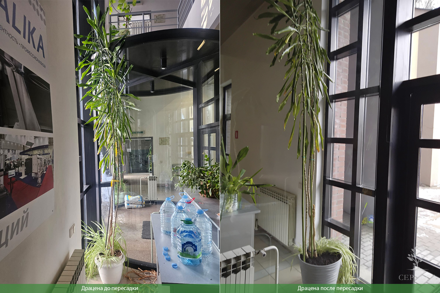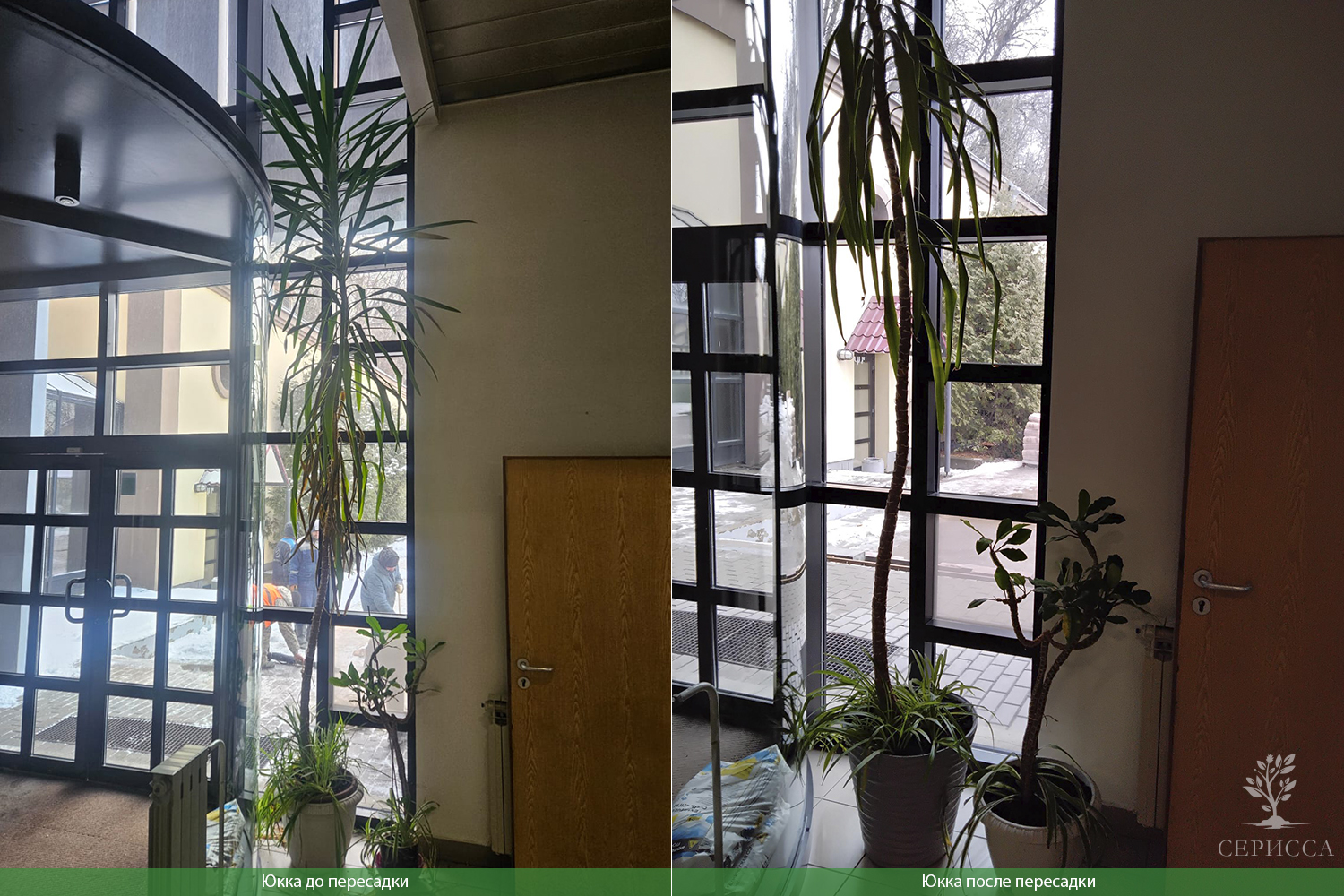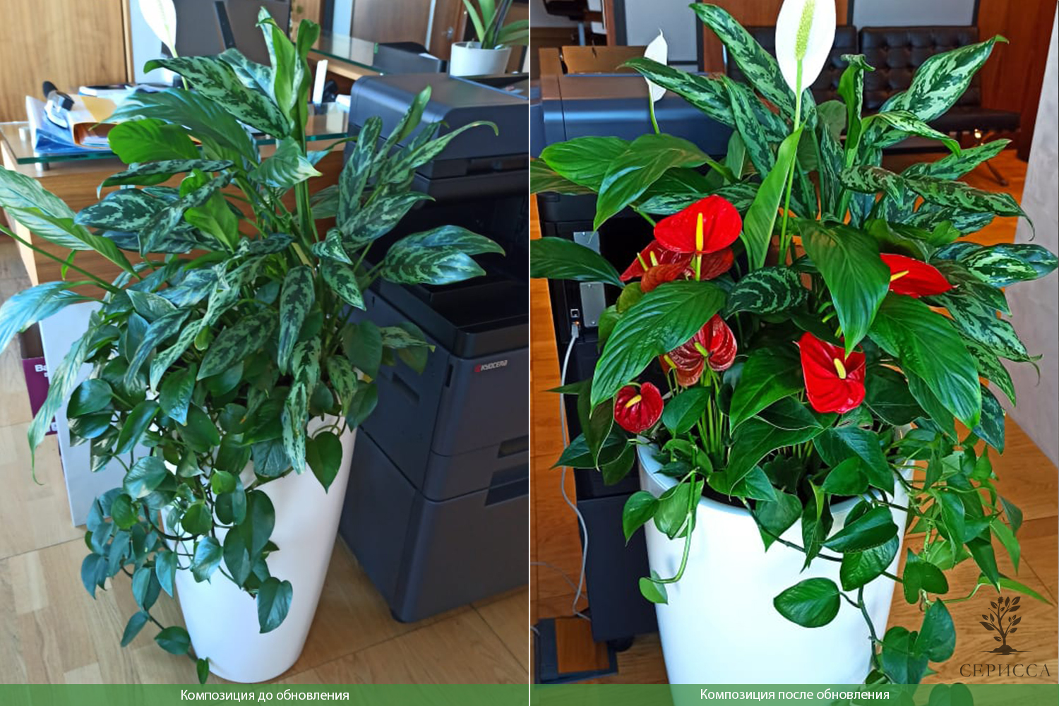 Профессиональное обслуживание растений с выездом флориста «Серисса» в офис включает в себя регулярный уход, такой как полив, удобрение, обрезка и замена по необходимости.